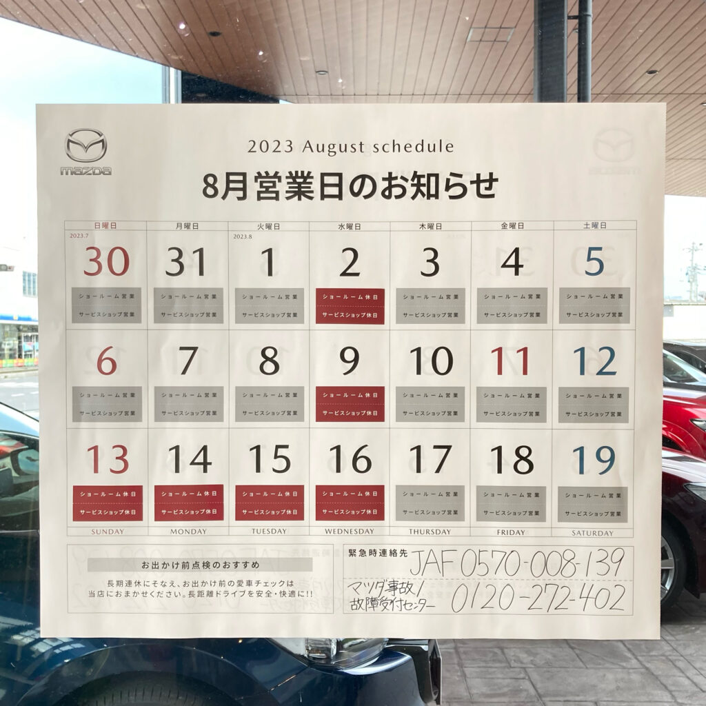 美作マツダ自動車は津山店・久世店・美作店で下記の通りお休みをいただきます。