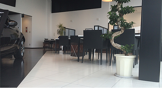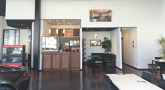 新車展示の他に、修理の方のウェイティングルームとしてごゆっくりお待ちいただけます。