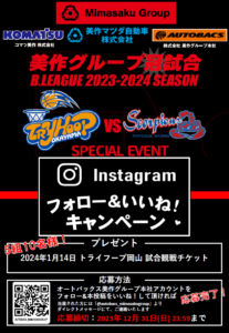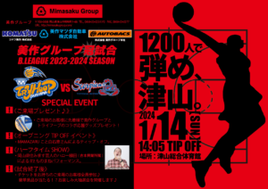 2024年1月14日(日)に津山総合体育館にて行われる『豊田合成スコーピオンズ』との試合では、我々美作グループが冠スポンサーデイとして応援をさせて頂きます。