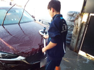 2日目は、学生と社会人との違いは何かということを学んで頂いた後に、我々にとって大事な仕事のひとつである【洗車】を体験してもらいました。単に洗車と言ってもお客様から預かった大切なお車なので傷をつけないのは当然のこと、普段では手の届きにくい隅々まで汚れを落とし、ピカピカに拭き上げることでお客様に満足と信頼を感じて頂けるとても大事な”仕事”です。